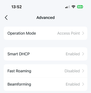 The following is an example for a TP-Link Deco M9 Plus Mesh Network. The Deco mobile app has in Advanced Settings an option for changing the operation mode.