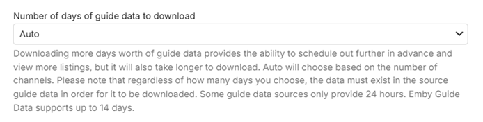 Also you can specify the amount of Guide Data that is loaded. You can manually set this from 1 to 14 days or leave it set to Auto. When you leave it set to Auto, Emby will choose the amount of days loaded based on how many channels you have defined to balance performance with the convenience of having as much guide data as possible.