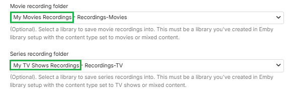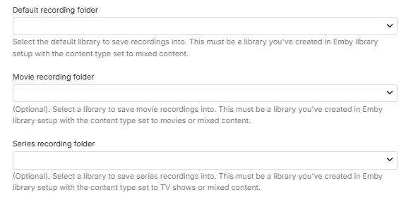 The next three options allow you to set the default recording library and folder path used within the existing libraries. It also allows you to set a specific library parent folder within the selected library. These library-folder paths will be used for recordings of all Movies and all TV Shows.