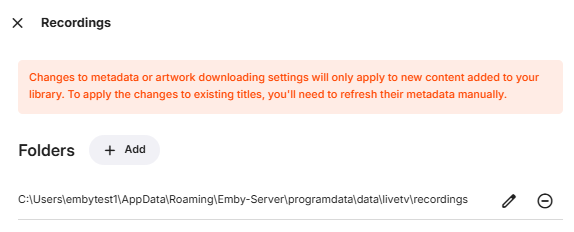 If you are changing the defaults for recording libraries, make sure you have full read/write permissions for Emby Server.