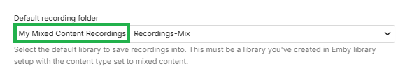 You can change the default folder for all recordings by first creating a Mixed Content library type as explained in Library Setup and then amend the Live TV Advanced setting for the Default recording folder . In the example below, a library was created named "My Mixed Content Recordings" and its library root folder path had a target subfolder named "Recordings-Mix". This is shown on this screen as "Library Name - Target sub-folder-name"
