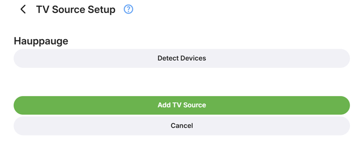 To add an Hauppauge device, click on + Add TV Source and select Hauppauge