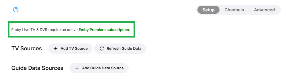 The Live TV & DVR feature requires a valid Emby Premiere subscription. This would be indicated on the setup screen when there is no subscription: