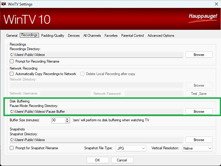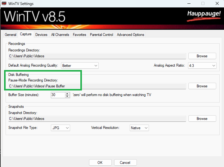 After ensuring that the tuning data is up to date, make sure the Hauppauge Pause Buffer path is setup and permissions are set for the Emby Server windows process for full access. To set the directory paths, on WinTV v10, select the Recordings tab and on WinTV v8.5, select the Capture tab. The Disk Buffering Pause-Mode Recording Directory is used by Emby Server for Live TV streaming and recordings.